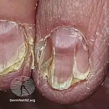 • Nail disease leading to V-shaped nicks at the edge of the nail.