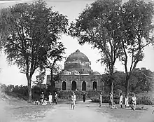 The tomb of Dariya Khan was built in 1453 during his lifetime. The tomb, the largest in Gujarat, is of brick with nine feet thick wall unlike other tombs in Ahmedabad which are made of stones. The tomb is made of the true arches and domes which create a cavernous interior as in Turko-Persian Islamic architecture. There is a large central dome surrounded by sixteen smaller domes and there are five entrances on each of the four sides of the structure. The interior houses the cenotaph surrounded by the arcaded verandah.[3][4][5] The site is encroached upon now.[6]
