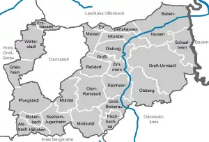 Darmstadt-Dieburg is a Kreis (district) in the south of Hesse, Germany. Neighboring districts are Offenbach, Aschaffenburg, Miltenberg, Odenwaldkreis, Bergstraße, Groß-Gerau, and the district-free city of Darmstadt, which it surrounds.