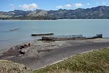 The wreck of Darra on Quail Island, lying prominently side-on.