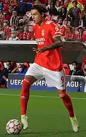 In May 2021, Núñez underwent surgery due to an injury on his right knee, forcing him to miss Benfica's first months of the new season.[29] He made his return from injury on 21 August, replacing Everton in the 72nd minute, in a 2–0 away victory over Gil Vicente, being booked in the process.[30] Following back-to-back braces against Santa Clara and Boavista in the Primeira Liga, he was named the league's Player of the Month and Forward of the Month for September.[31] On 29 September, he scored his first two Champions League goals in a 3–0 home victory over Barcelona, and was named man of the match.[32] On 27 November, he scored his first hat-trick in the league as his team finished the first half at B-SAD 7–0 up, though the game was abandoned early in the second half due to insufficient players on the COVID-affected host team.[33] He added another treble on 12 December against Famalicão in a 4–1 away win, becoming the seventh player in the league to score back-to-back hat-tricks.[34] Three days later, he scored two goals in a 3–0 home win over Sporting da Covilhã to send his team into the semi-finals of the 2021–22 Taça da Liga,[35] though, while he was away on international duty for Uruguay, Benfica were defeated 2–1 by crosstown rivals Sporting CP in the 2022 Taça da Liga Final.[36]