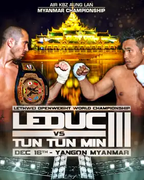 Dave Leduc vs. Tun Tun Min III, also known as The Biggest Fight In Lethwei History,[2][3][4] was a Lethwei world title match between undefeated openweight Lethwei World Champion Dave Leduc and former openweight Lethwei World Champion Tun Tun Min that took place at Thein Pyu Stadium in Yangon, Myanmar, on December 16, 2018.[5]