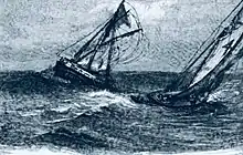 In the Scribner's Magazine for May, 1888, William Perry Northrup told the story of a cruise made by the New York pilot boat David Carll, No, 4 when she made an attempt, in the rough weather, to tow an abandoned three-masted bark Alice Roy Quebec into the New York port. Pilots Frank Nelson, William Maxwell, Dennis Reardon, Robert G. Sylvester, Allan M. Beebe, and Jeremiah Reardon were on duty. They took a yawl over to the bark to inspect her and add a hawser to try to tow her into port. When that failed, they placed a ship light high up on her stay rope as she was in the steamers' track.[9][10]