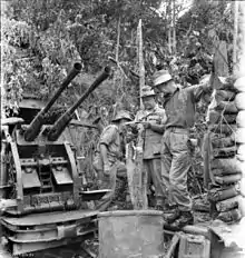 After El Alamein Whitehead and his brigade returned to Australia in early 1943 to participate in operations against the Japanese. The 26th Brigade took part in the Landing at Lae in September 1943 and the Huon Peninsula campaign from October 1943 to January 1944.[6] Following these campaigns the brigade returned to Australia, and did not see action again until 1945. In May 1945 Whitehead commanded the Australian landing at Tarakan. During this operation the 26th Brigade was expanded to almost the size of a division, and United States Army and Netherlands East Indies units served under Whitehead's command.[6] Whitehead relinquished command of the 26th Brigade on 10 December 1945 and returned to Australia two days later.[5]