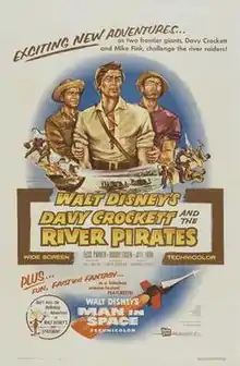 Davy Crockett and the River Pirates is a 1956 American Western film produced by Walt Disney Productions. A prequel to Davy Crockett: King of the Wild Frontier, it was thought of as a means to salvage revenue from the blunder of Disney killing off the Davy Crockett character too soon within the three program arc ending in the Alamo massacre, greatly diminishing the value that could've been derived from what surprisingly had exploded into a worldwide phenomenon. The feature film is an edited, repurposed and recut compilation of the last two episodes of the Davy Crockett television miniseries.[1] Episodes from the miniseries with footage from the film include: Davy Crockett's Keelboat Race and Davy Crockett and the River Pirates. The film stars Fess Parker as Davy Crockett and Buddy Ebsen as Crockett's amiable sidekick.[2]