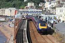 ![]() Dawlish station seen from the beach in 2018, before the sea wall was raised to platform level | |