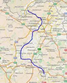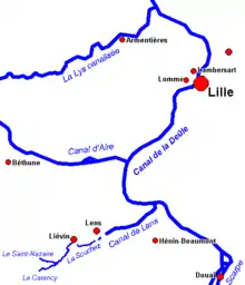 • the Canal de Lens,[2] fed by the Souchez,[3] which connects Lens with the Canal de la Deûle at Courrières.