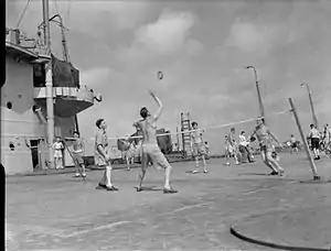 Deck tennis is a sport that is played by mariners on the decks of both cargo and passenger vessels. The sport is a hybrid between tennis and quoits, and is played with either the rubber disk or ring, or a similarly-sized rope ring. The sport has been standardized and formalized in several countries under names such as "tennikoit" or "ring tennis".