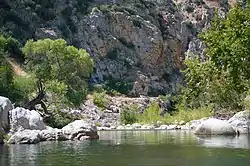 The creek continues north, at the bottom of a deep gorge through mountainous wilderness, receiving Holcomb Creek and Coxey Creek from the right before turning west, forming a canyon between the San Bernardino Mountains and Ord Mountains.[8][9] The Deep Creek Hot Springs are located along the stream where it turns to the west. The Pacific Crest Trail follows the Deep Creek canyon for 16 miles (26 km), from the confluence of Hooks Creek to the mouth.[10]