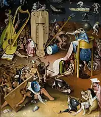 A detail of the right panel of the triptych The Garden of Earthly Delights painted in the late 15th century by Dutch master Hieronymus Bosch, depicting Hell in a highly symbolic fashion.[33]
