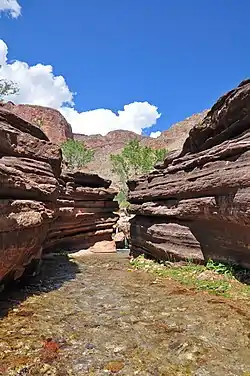 Deer Creek is a stream that flows through the western part of the Grand Canyon, in the U.S. state of Arizona, as a right-bank tributary of the Colorado River. A series of natural springs provide for a perennial flow in Deer Creek. During periods of intense rainfall, Deer Creek can experience severe flash flooding. In the final half mile above the Colorado River, Deer Creek flows through a narrow slot canyon before plunging over a 150-foot (46 m) waterfall named Deer Creek Falls.[1]