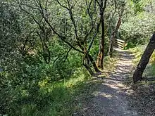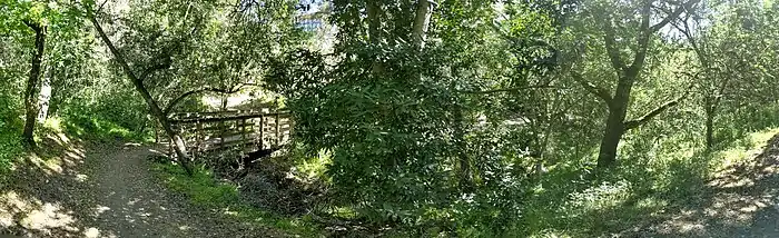 A bridge across a branch of Deer Creek near its source in Los Altos Hills. Here the pathway down from Taafe Road, which crosses the other branch behind here, crosses to the Broken House Path.