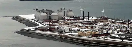 Wastewater from the 43 communities in the Boston area served by the MWRA reaches the plant through four tunnels. Three pump stations with a combined capacity of 1270 million gallons per day (mgd) lift the wastewater about 150 feet to primary treatment clarifiers that use gravity to remove about half of the pollutants. The next stage, secondary treatment, uses pure oxygen to activate microorganisms that consume organic matter. Deer Island cryogenically generates 130 to 220 tons of oxygen per day for this purpose. Sludge and scum from the primary and secondary treatment stages are thickened and fed to twelve 130 foot high egg-shaped digesters. Methane gas produced by the digestion process is burned to make steam which is fed to a turbine that generates about 3 megawatts of electricity and provides heat for the treatment processes and keeping buildings warm. (Additional on-site power began generation by two 600 kW wind turbines in 2009).[9] Digested sludge is then sent across the harbor via a tunnel to a pelletizing plant at the Fore River Shipyard in Quincy. The output is sold as fertilizer and shipped to customers by rail and truck.[10]