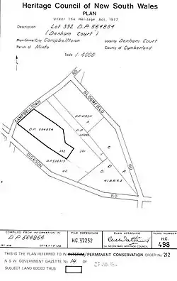 1. 1 2 3 4 5 6 7 8 9 10 11 12 13 14 15 16 17 18 19 20 21 22 23 24 25 26 27 28 29 30 31 32 33 34 35 36 37 38 39 40 41 42 43 44 45 46 47 48 49 50 51 52 53 54 55 56 57 58 59 "Denham Court". New South Wales State Heritage Register. Department of Planning & Environment. H00212. Retrieved 1 June 2018. Text is licensed by State of New South Wales (Department of Planning and Environment) under CC-BY 4.0 licence.