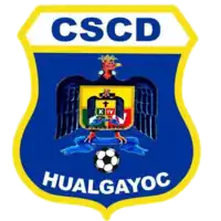 Deportivo Hualgayoc's badge is the coat of arms of the Hualgayoc District which is an Andean condor as the single supporter wearing a crown with an escutcheon divided in three quarters superimposed in itself with a classic telstar pattern ball on its feet on a blue escutcheon with the initials "CSCD" on top and the word "Hualgayoc" on bottom.