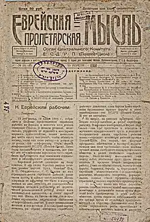 Der proletarisher gedank (Yiddish: דער פראלעטארישער געדאנק, 'The Proletarian Thought') was a journal published in Soviet Russia 1919–1927.[1][2][3] It was the organ of the Central Committee of the Jewish Social Democratic Labour Party (Poalei Zion) (later renamed the Jewish Communist Labour Party (Poalei Zion)).[4][5][6] It was initially published in Russian language under the title Evreiskaya proletarskaya mysl (Russian: Еврейская пролетарская мысль, 'Jewish Proletarian Thought') until 1926, before becoming a Yiddish language publication in 1926.[2][3][7] Evreiskaya proletarskaya mysl was initially issued from Kiev, then shifting to Kharkov and eventually began to be issued from Moscow.[1][8][9] The journal was printed at the Molot print shop in Moscow.[7] The newspaper was one of a handful of non-communist Jewish newspapers allowed to be published legally, albeit under supervision of a censor.[10]
