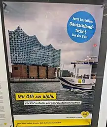 A BVG advert advertising the Deutschlandticket using the Hamburg's Elbphilharmonie.