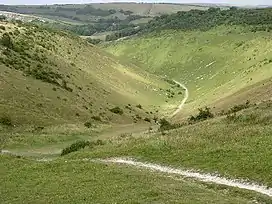 Devil's Dyke is a 100 metre (300') deep V-shaped dry valley on the South Downs in Sussex in southern England, 5 miles (8.0 km) north-west of Brighton. It is managed by the National Trust, and is also part of the Beeding Hill to Newtimber Hill Site of Special Scientific Interest.[1] Devil's Dyke was a major local tourist attraction in the late 19th and early 20th centuries. It is now a popular viewpoint and site for walking, model aircraft flying and hang gliding.[2] The South Downs Way passes the site.