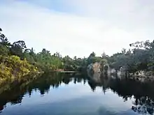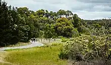 The park contains two decommissioned water supply reservoirs, the Devilbend Reservoir and Bittern Reservoir, which are less than 600 m (660 yd) apart and linked by an often-dry drainage channel. These reservoirs were the original reason the surrounding parkland was protected from general public access and was not subjected to land development.[1] Both reservoirs are along the course of the eponymous Devilbend Creek, a left tributary of the much larger Balcombe Creek that drains into Port Phillip Bay at Mount Martha. Nearby just 500 m (550 yd) in the north, there is a much smaller, unnamed third lake further downstream along the creek in the neighbouring locality of Moorooduc, next to a golf course within what is known as the Devilbend Recreation Reserve.