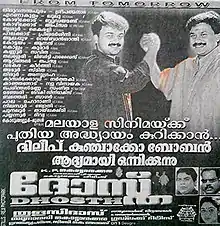 Dhosth (transl.Friend) is a 2001 Indian Malayalam-language action thriller film directed by Thulasidas. Dileep and Kunchacko Boban share the title role with Kavya Madhavan, Jagathy Sreekumar and Kalabhavan Mani in supporting roles. It is a remake of Tamil film Kannedhirey Thondrinal (1998).[1][2][3][4] The film was a box office success.[5]