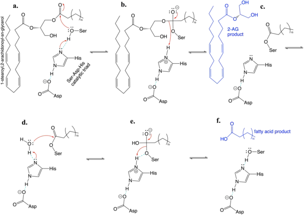 Diacylglycerol lipase mechanism.[10][9] Products are shown in blue. Intermolecular interactions are shown in cyan. Arrow-pushing is shown in red.