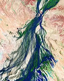 The Diamantina River in Australia during the spring floods, 2023. Landsat data from the U.S. Geological Survey. False-color image: see text at image file for explanation.