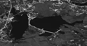 Oblique view of Arnold Mills Reservoir (left) and Diamond Hill Reservoir (right) in 1974