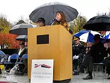 Diane Carlson Evans addresses an audience at the Vietnam Veteran's Memorial Wall in Washington, D.C., on Veterans Day, Nov. 11, 2009.