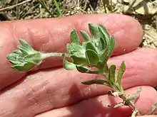 Diaperia prolifera is an annual herb up to 15 cm (6 inches) tall, grayish green to silvery because of thick woolly pubescence. The stem branches above ground, with leaves up to 15 mm long. Flower heads are usually produced one at a time, but occasionally in groups of 2–3.[3][4][5][6]