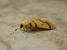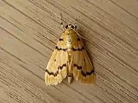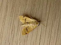 The wingspan is about 20 mm. Adults are bright yellow, with black zig-zag lines across the wings, and a prominent black spot near the middle of each forewing.[2]