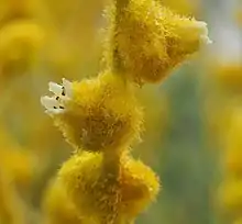 Dicrastylis beveridgei is a shrub, growing to 1 m high, in red sand, on sand dunes. Its stems are roughly circular in cross section. The opposite and entire leaves are 10โ€“22 mm long by 2.5โ€“5 mm wide, and have branched (dendritic) hairs, and a blistered, puckered surface. There are no bracteoles, but there are bracts which are 2.2-2.5. mm. The flowers are sessile. The calyx has five lobes (0.8-1.2 mm long), which are covered in dendritic hairs, and the yellow and white corolla is 3โ€“4 mm long, with no dots or stripes in its throat. There are five stamens. Flowers may be seen from January to December.[4]