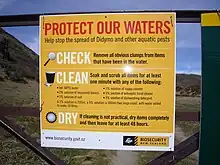 In 2004 Didymosphenia geminata, a diatom commonly known as didymo or rock snot,[1] was discovered in New Zealand, the first time it was found in the Southern Hemisphere. To restrict its spread, the whole of the South Island of New Zealand was declared a controlled area in December 2005. All items, such as boats, fishing gear, clothing, and vehicles, that have been in a stream, river or lake, must be cleaned before they enter another waterway. Biosecurity New Zealand working with Environment Southland, AgriQuality and Fish and Game New Zealand launched an extensive public awareness campaign to encourage river users to clean their equipment after use in affected waterways. This campaign was highly successful, with 99% of freshwater users surveyed in 2008 in the South Island being aware of didymo.[2]