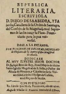In 1640, Saavedra published the anti-Machiavellian emblem book Empresas Políticas. Idea de un príncipe político cristiano ("Political Maxims. Idea of a Christian Political Prince"), a hundred short essays about the education of a prince.[3][4] This work was written primarily for the son of King Philip IV. It passed through a number of editions and was translated in several languages. An unfinished historical work, entitled Corona gótica, castellana, y austriaca políticamente ilustrada, appeared in 1646. Another work ascribed to Saavedra, the República literaria, was published posthumously in 1670; it is a satirical discussion on some of the leading characters in the ancient and modern world of letters.[2] Saavedra's Idea de un príncipe político cristiano ("The Idea of a Christian political prince", 1640) was a very erudite work that uses the literary sort of emblem, put by Andrea Alciato with his Emblemata translated in 1549 and that has a mainly moral and philosophical character. His work, however, was mainly inspired by the Emblemata política (1618), by Jakob Bruck Angermunt, being the intention of the author to compose a guide for the suitable political formation of a Christian prince. As a historian wrote Corona gótica, castellana y austríaca (1648), that tried to be a biographical repertoire of the Visigothic kings of Spain.