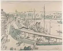 The passenger terminal was damaged beyond repair during World War II. It was demolished soon afterwards and, after several years when passengers used temporary buildings, a new two-storey concrete terminal building in a modernist style was opened on 17 June 1953. It had three railway tracks, one of them running along the side of the quay, and could handle two locomotive-hauled boat trains and the local railcar to Rouen. In the 1960s, diesel traction began to replace steam locos on the boat trains operating to and from the harbour station.[1]
