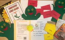 The Dimoitou program was originally created by a Quebec company known as "Centre éducatif et culturel" (now called Les Éditions CEC).[1] The program was often considered unusual by teachers and students alike, both because the name "Dimoitou" was never given a clear definition or meaning ("dimoi" and "tou" loosely translate to "tell me all", suggestive of a portmanteau), and because much of the program revolved around titular character Dimoitou being sick or injured, with accompanying workbooks teaching English-speaking children how to say French phrases revolving around injury, illness and pity. This led to a satire piece in 2019 released by journalist Shauna Chase and French teacher Giselle LeBlanc discussing the "death" of Dimoitou, which was no longer being included as part of the French curriculum in Atlantic Canada; LeBlanc revealed that she still had the original Dimoitou puppet, which was quite large, in a shoebox packed away in her classroom, sharing a photo of herself with the puppet and some of her students.[3]