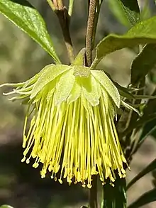 Diplolaena microcephala, commonly known as lesser diplolaena,[2] is a rounded, spreading shrub about 1.5 m (4 ft 11 in) high and similar width. The grey-green leaves are elliptic shaped, margins folded inwards, up to 30–40 mm (1.2–1.6 in) long on a petiole 2–4 mm (0.079–0.157 in) long. The leaf upper surface is sparsely covered with large rusty coloured star-shaped hairs, the underside moderately covered with stiff, large rusty coloured star shaped hairs. The outer bracts are egg-shaped to triangular, 6–10 mm (0.24–0.39 in) long, covered with short, soft, rusty coloured hairs. The inner bracts narrowly oblong to narrowing triangular, slightly longer than outer bracts. The pendulous flowers are 25 mm (0.98 in) across, with prominent stamens 15–20 mm (0.59–0.79 in) long and vary in colour from red-green, red-orange or pinkish and are borne at the end of branches. Flowering occurs sporadically throughout the year.[3][4][5]