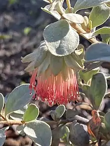 Diplolaena mollis is a species of flowering plant in the family Rutaceae and is endemic to the west coast of Western Australia. It has broadly elliptic or egg-shaped, leathery leaves that are densely covered in hairs and reddish, pendulous flowers.