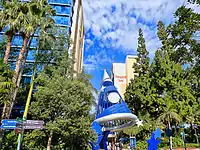 Disneyland Hotel towers from Downtown Disney. Dreams Tower is at left; Magic Tower at right. The area in foreground was previously the site of the Plaza Building.