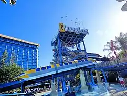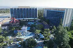 In early 1997, Vacationland was closed and demolished.[12] Then in 1999, a significant portion of the hotel was also demolished, all to make way for Downtown Disney and parking areas for the newly expanding Disneyland Resort. Most buildings east of the Sierra Tower and north of the Marina Tower were demolished, including the original hotel buildings from 1955.[13] The only buildings remaining in these areas are the convention center and parking garage. Recreational facilities were built in the quad between the three towers, previously site of the Water Wonderland, to replace those that were previously located east of the Sierra Tower.