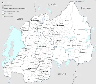 Prior to 2002, Rwanda was composed of prefectures, subprefectures (which were sometimes called "districts")[1] and 154 communes (Kinyarwanda: imijyi, sing. umujyi).[2][3] In 2002, communes were replaced by two kinds of divisions called districts and municipalities (Kinyarwanda: akarere and umujyi).[2] In 2006, the number of districts was reduced from 106 to 30.[2]