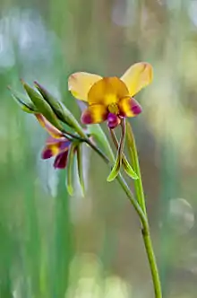 Diuris corymbosa, commonly called common donkey orchid or wallflower orchid,[2] is a species of orchid which is endemic to the south-west of Western Australia. It is similar to the purple pansy orchid (Diuris longifolia) but its flowers are yellow rather than purple or mauve and it flowers earlier in the year. It also resembles the winter donkey orchid (Diuris brumalis) but flowers later than that species. It is one of the most common orchid species in the Perth area, often forms extensive colonies and usually has numerous flowers on the one spike.[2][3]