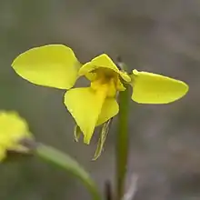 Diuris monticola, commonly known as highland golden moths,[2] is a species of orchid that is endemic to south-eastern Australia. It is a common and widespread, late flowering species growing in grassland and woodland habitats at higher altitudes. It has a tuft of up to nine leaves at the base and up to four slightly drooping bright yellow flowers with dark streaks in the centre.