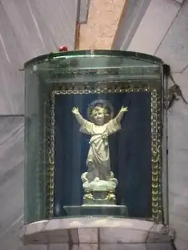 In 1942, after years of finishing church construction, Rizzo discovered a child Jesus statue in a nearby shop called El Vaticano. In the shop was the statue by an anonymous Italian sculptor who fashioned a likeness of the child Jesus with a cross in the back, as in Rizzo's vision. Rizzo ordered the cross to be removed from his back and that the owner inscribe the words Yo reinaré (English: I will reign) at the base of the statue, which he brought to his new parish,[1] where he began to preach about the favors the Christ Child does for those who have faith and who help the poor.[2]