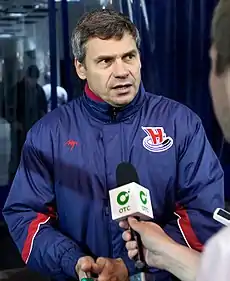 Dmitri Vyacheslavovich Kvartalnov (Дмитрий Вячеславович Квартальнов; born March 25, 1966, in Voskresensk, Soviet Union) is a retired professional ice hockey player who played 112 games in the National Hockey League, all with the Boston Bruins. He had at least a point in his first 14 NHL games, which stands as the NHL record for longest point streak from the beginning of a career, tied with Joe Malone.[1] This streak lasted from October 8 to November 12, 1992, during which time he scored 12 goals and 10 assists.[2]
