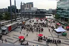 The idea for MediaCityUK began in 2004, when BBC announced that it was interested in moving hundreds of jobs away from London to another UK city.[3] The Peel Group was involved from the early stages of this move, which resulted in announcing the construction of a 200-acre development in Salford Quays, Greater Manchester. The BBC and The Peel Group announced in 2007 that the construction would begin on the media-based development.[4]