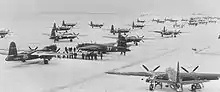 Four runways (150 feet wide and 6,500 feet in length) were constructed, while six 75-foot taxiways connected the parking apron (600 x 5,300 feet) with the runway system. Work on the main construction project, begun on 5 August 1942, was completed by 31 December. Three or four days prior to completion of the main project, work was begun on the second most important project (principally concerned with completion of the runway system), which was finished by 31 March 1943. In addition to the main base and airfield, there are at least four auxiliary fields that were also constructed for emergency and training use in the area along with the use of Dodge City Municipal Airport