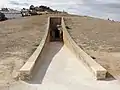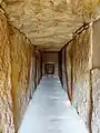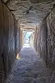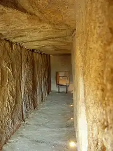 The left and right sides of the corridor appear to have consisted originally of sixteen slabs each; fourteen remain on the left and 15 on the right. Five larger slabs are intact in the roof, and there are fragments of two others; it would appear that three or four more have been entirely lost. The end of the corridor is a single large monolith with a square hole near its center. This and three other monoliths surround the chamber[2][6] There is a notable difference between the stones on the sides and those of the roof: the former is much more carefully worked and fit perfectly into the recesses made in the stones of the entrance and the floor.