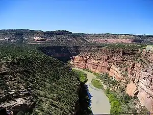Downstream from McPhee Dam, the river re-enters Dolores County and carves the Dolores River Canyon, which stretches north for over 40 miles (64 km) and averages 1,100 feet (340 m) deep.[7] This section of the Dolores River is noted for its exposed sedimentary strata, desert wildlife, and during years of heavy snowmelt for its whitewater.[8] Near Egnar the river crosses into San Miguel County and then from there into Montrose County.[6]