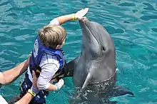 In 1978, Dr. David Nathanson, an American clinical psychologist born in Glasgow,[14] started language experiments using swimming with dolphins as a motivator in teaching children with Down's Syndrome at Ocean World in Fort Lauderdale, Florida.[15][16] Nathanson found that when children were rewarded with dolphin swims for giving correct responses, they learned four times faster and retained information for longer.[14] From 1988 to 1994, he ran a Dolphin Research Center in Grassy Key, Florida,[11] which proved popular with families who were willing to pay a considerable expense for the therapy;[14] it was even said to have helped some severely disabled children regain speech.[15] In 1995, he moved his Dolphin Human Therapy centre to Key Largo, offering services for disabilities including learning difficulties, brain and spinal cord injuries, blindness, deafness, and other sensory handicaps.[15]