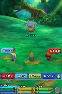 The errands that can be undertaken at the request of townspeople and the bounty hunts available from the Taskmaster are collectively known as "tasks". When tasks are completed, players will earn a number of stamps for their current merit stamp card, which can be exchanged for upgrades.[1] Players take part in battles using the Magic Master book, which contains various spells that are activated using drawings with the stylus.[7] During battles, players can arrange their characters anywhere on the bottom screen to implement various tactics; for example, a character that can block certain attacks can be placed in front of others to shield them.[8]